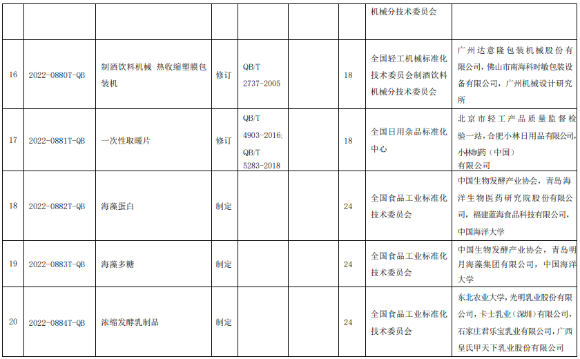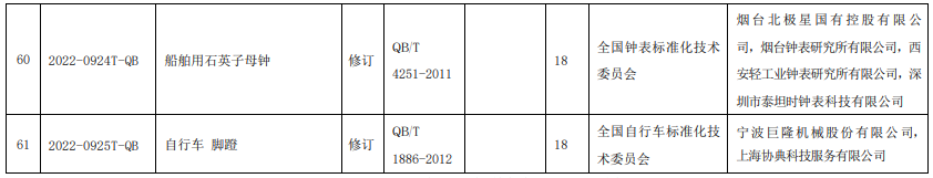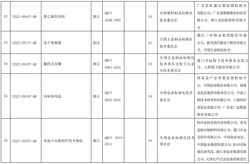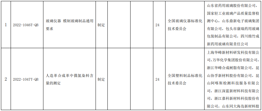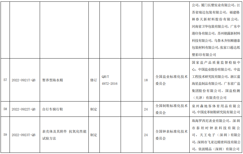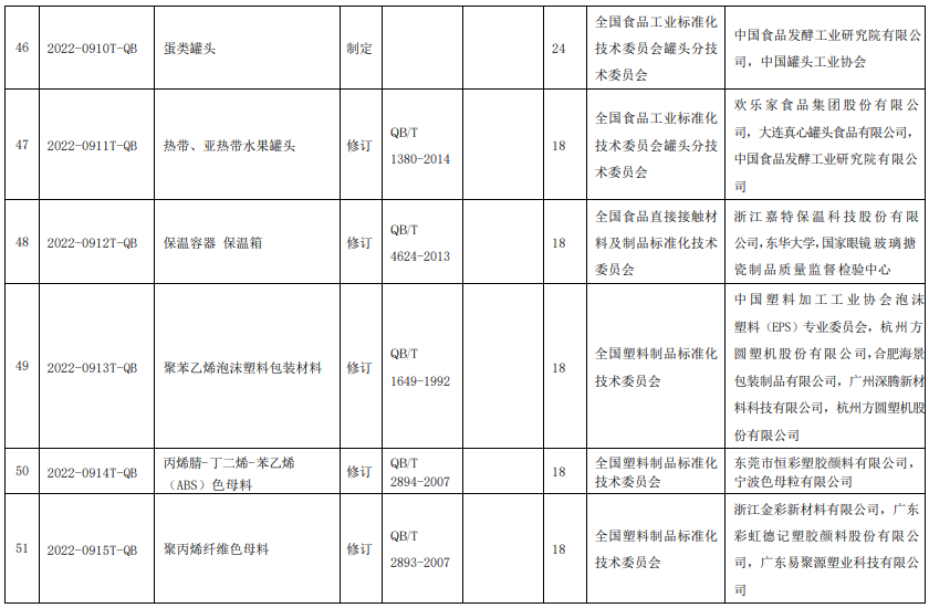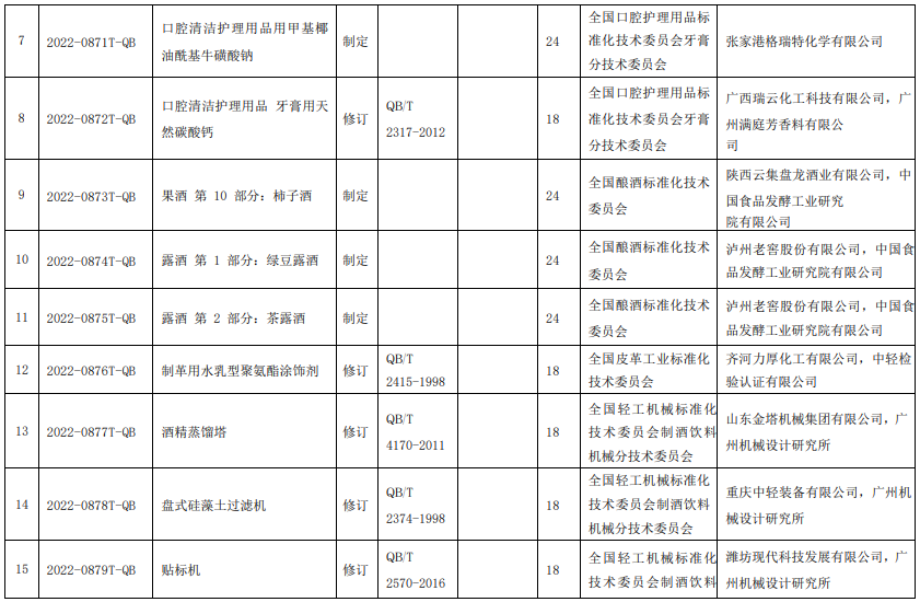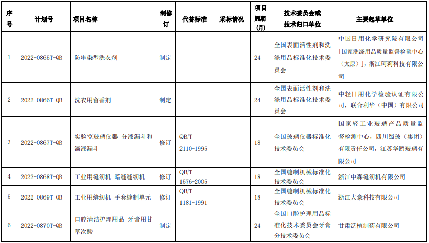 7月14日,工業(yè)和信息化部辦公廳發(fā)布關(guān)于印發(fā)2022年第二批行業(yè)標(biāo)準(zhǔn)制修訂和外文版項(xiàng)目計(jì)劃的通知。2022年第二批行業(yè)標(biāo)準(zhǔn)制修訂項(xiàng)目計(jì)劃共包括638項(xiàng)。其中,制定450項(xiàng),修訂188項(xiàng);重點(diǎn)和基礎(chǔ)通用標(biāo)準(zhǔn)352項(xiàng),其他標(biāo)準(zhǔn)286項(xiàng)。行業(yè)標(biāo)準(zhǔn)外文版項(xiàng)目計(jì)劃40項(xiàng),其中翻譯標(biāo)準(zhǔn)29項(xiàng),同步制定11 項(xiàng)。本批計(jì)劃包括《防串染型洗衣劑》等61項(xiàng)輕工領(lǐng)域產(chǎn)業(yè)優(yōu)化升級類標(biāo)準(zhǔn),《玻璃儀器模制玻璃制品通用要求》等13項(xiàng)其他類輕工行業(yè)標(biāo)準(zhǔn)和《拖鞋》輕工行業(yè)標(biāo)準(zhǔn)外文版計(jì)劃,具體如下所示。