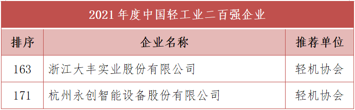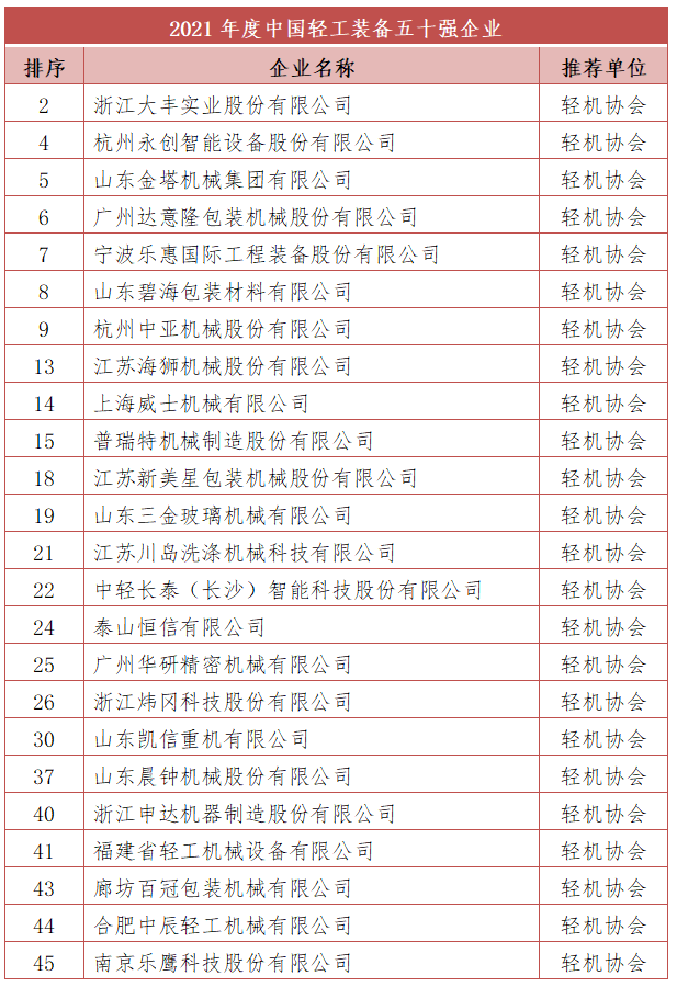 由中國(guó)輕工機(jī)械協(xié)會(huì)推薦的輕工裝備企業(yè),榮登2021年度中國(guó)輕工業(yè)二百?gòu)?qiáng)企業(yè)榜單: