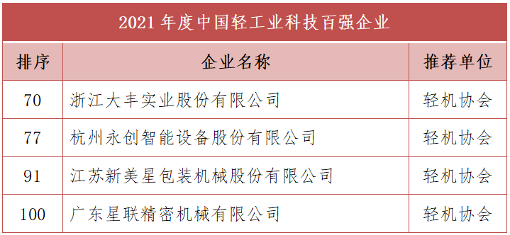 由中國(guó)輕工機(jī)械協(xié)會(huì)推薦的輕工裝備企業(yè),榮登2021年度中國(guó)輕工業(yè)科技百?gòu)?qiáng)企業(yè)榜單: