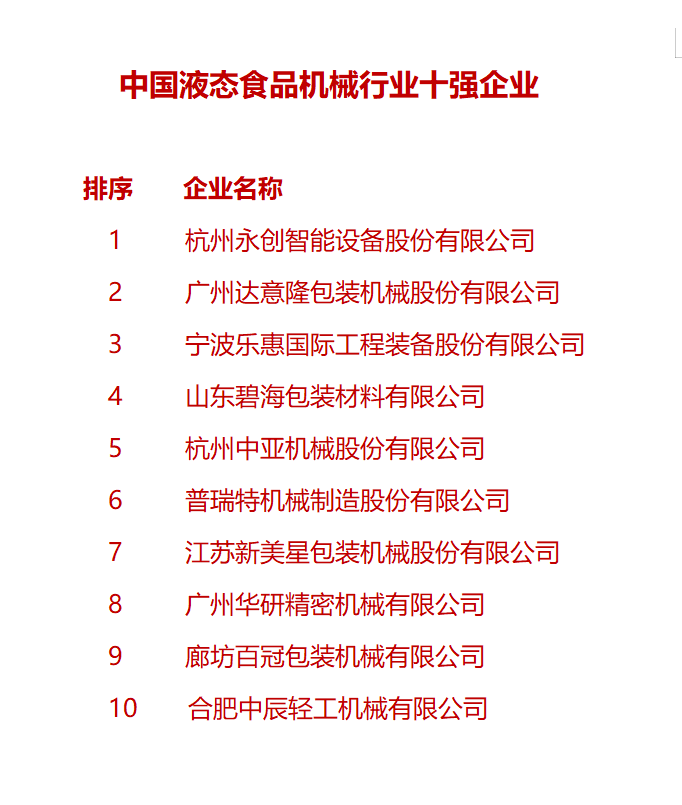 中國(guó)液態(tài)食品機(jī)械行業(yè)十強(qiáng)企業(yè)