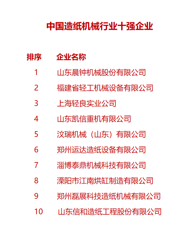 中國(guó)制漿造紙機(jī)械行業(yè)十強(qiáng)企業(yè)