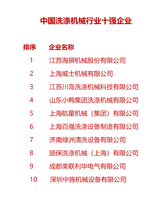 中國(guó)洗滌機(jī)械行業(yè)十強(qiáng)企業(yè)