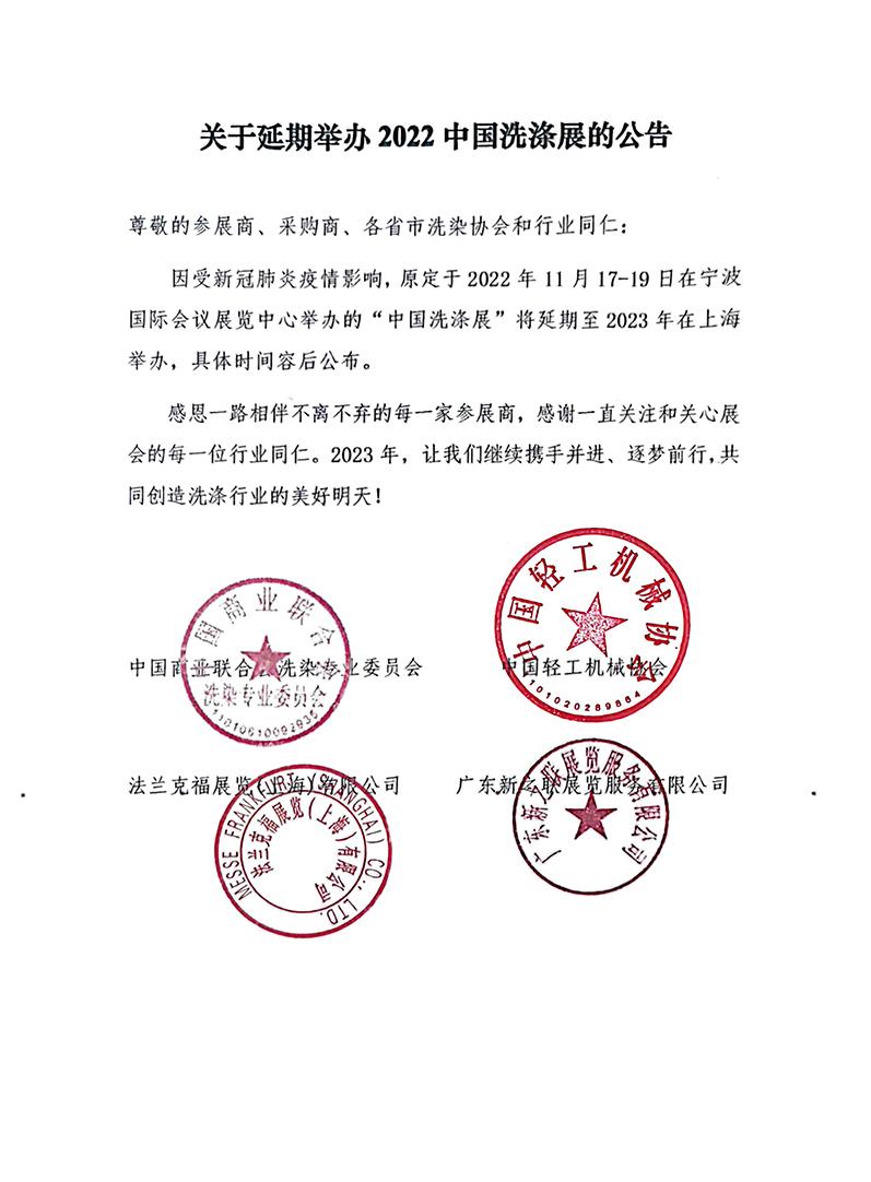 由中國輕工機械協(xié)會、中國商業(yè)聯(lián)合會洗染專業(yè)委員會、法蘭克福展覽(上海)有限公司和廣東新之聯(lián)展覽服務(wù)有限公司聯(lián)合主辦的“2022中國洗滌展”,將延期至2023年在上海舉辦。主辦方對行業(yè)同仁一直以來的支持與理解表示衷心的感謝。