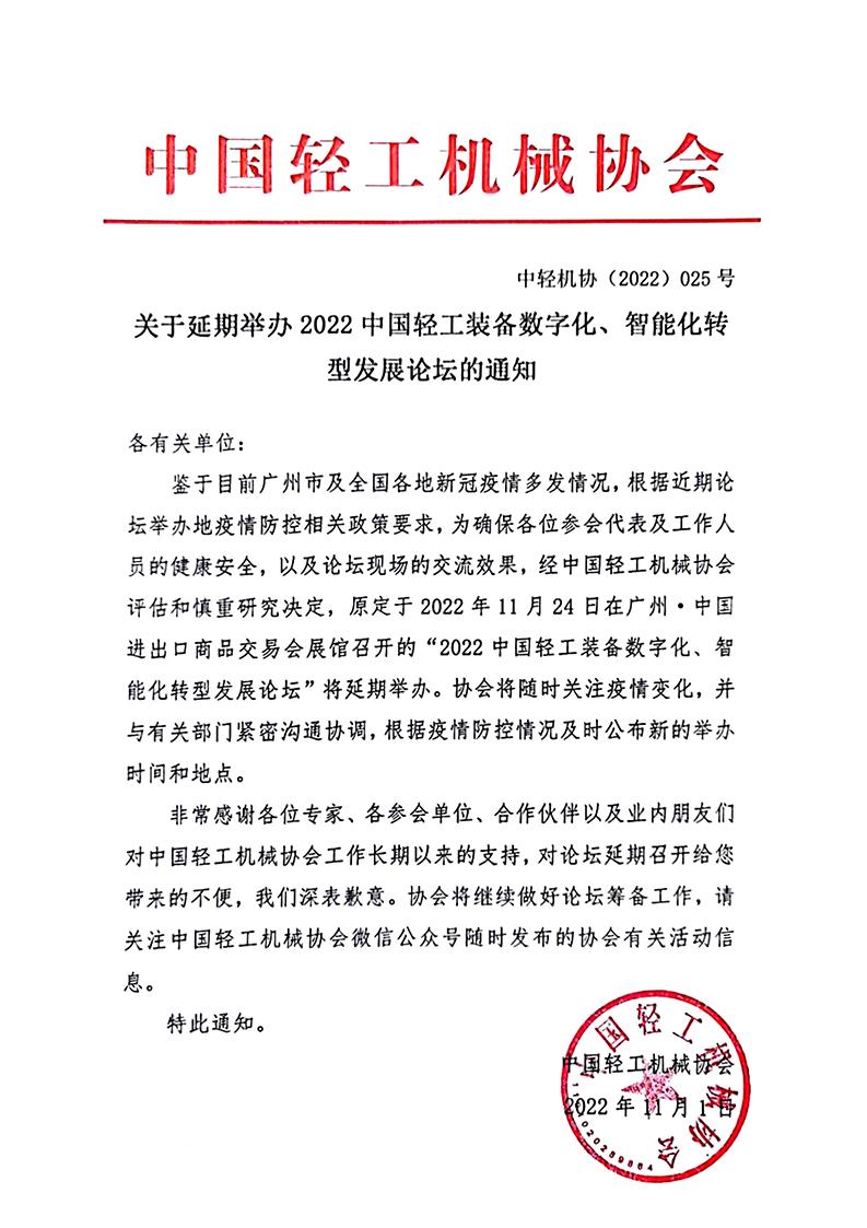 關(guān)于延期舉辦2022中國輕工裝備數(shù)字化、智能化轉(zhuǎn)型發(fā)展論壇的通知