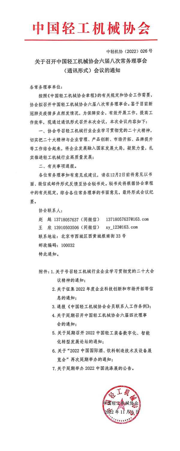 關(guān)于延期召開中國(guó)輕工機(jī)械協(xié)會(huì)六屆八次常務(wù)理事會(huì)(通訊形式)會(huì)議的通知