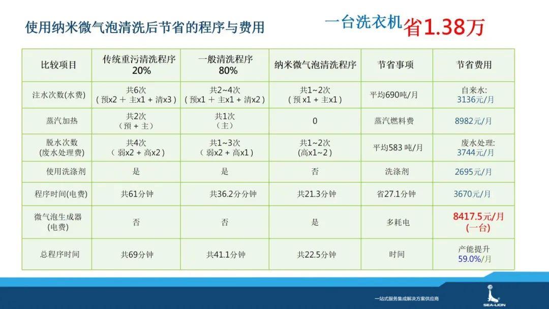 從上述測試數(shù)據(jù)可以顯示:一臺100公斤的水洗機(jī),使用微粒子氣泡技術(shù)之后,一個(gè)月基本上可以省費(fèi)用1.38萬元,因?yàn)樗恍枰獰嵩?,效率更高、不用化學(xué)藥劑、耗水更低。經(jīng)過客戶一年測試,目前15臺洗衣機(jī)一個(gè)月大約能節(jié)約20.7萬元,同時(shí)在此基礎(chǔ)上實(shí)現(xiàn)增產(chǎn)59%。