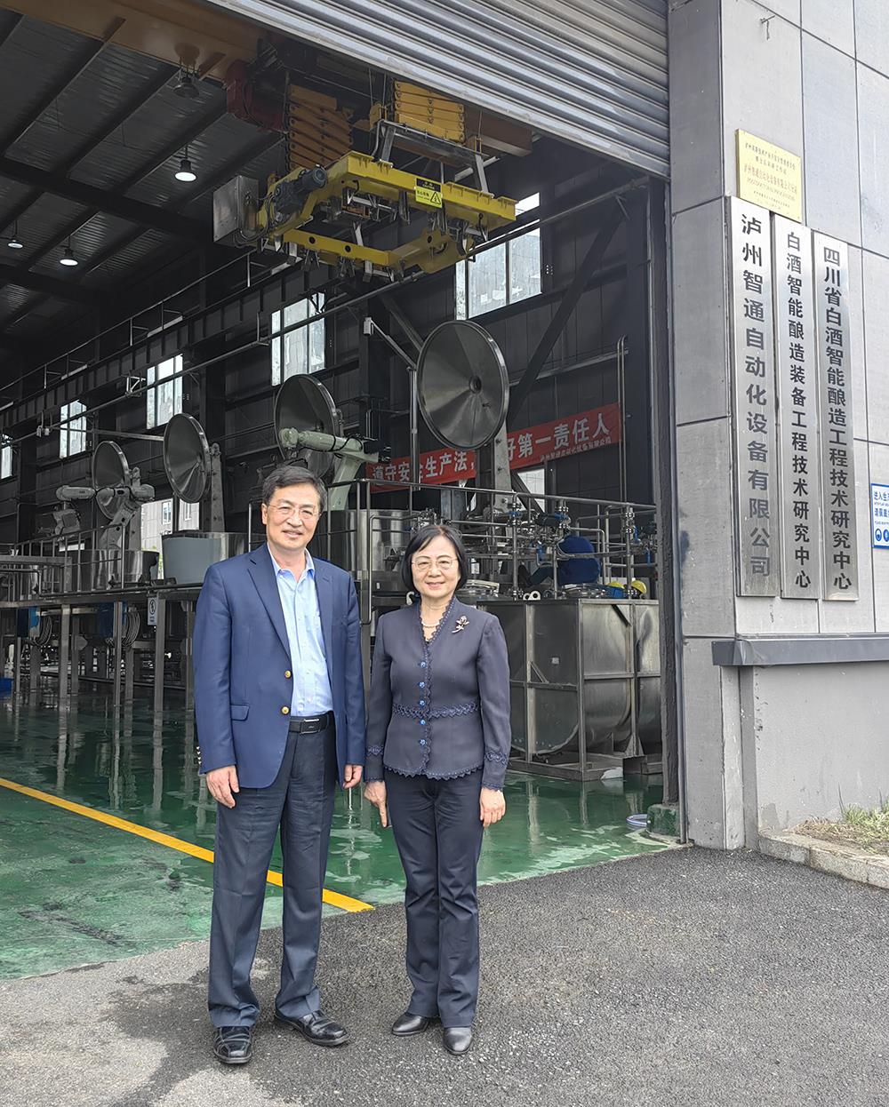 孫總陪同王欣參觀了工廠并詳細(xì)介紹了瀘州智通公司的發(fā)展歷史、研發(fā)團(tuán)隊和主要產(chǎn)品。瀘州智通公司始創(chuàng)于2015年,是國家高新技術(shù)企業(yè),國家級專精特新“小巨人”企業(yè),四川省成果轉(zhuǎn)移轉(zhuǎn)化示范企業(yè)。瀘州智通公司深耕白酒行業(yè)釀造生產(chǎn)領(lǐng)域,將人工智能技術(shù)及機(jī)器人裝備引入白酒釀造工藝,研制了原輔料管理、智能起、入窖、精準(zhǔn)配糟、機(jī)器人“輕撒勻鋪、探氣上甑”、量質(zhì)分段摘酒等生產(chǎn)過程的全套自動化和數(shù)字化裝備,精準(zhǔn)地控制了發(fā)酵品質(zhì)和精度,保證了原料品質(zhì)的統(tǒng)一,極大提高了出酒品質(zhì)和穩(wěn)定性。其釀酒自動化、智能化裝備及控制系統(tǒng)已成功在國內(nèi)多家知名白酒企業(yè)應(yīng)用,累計成功建設(shè)智能釀酒生產(chǎn)線160余條,實現(xiàn)銷售收入超過10億元,現(xiàn)已成為白酒釀造設(shè)備領(lǐng)域的龍頭企業(yè)。