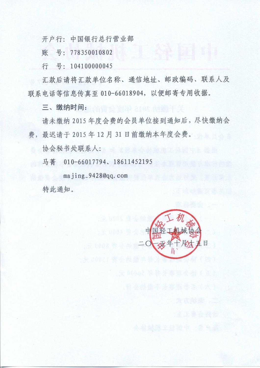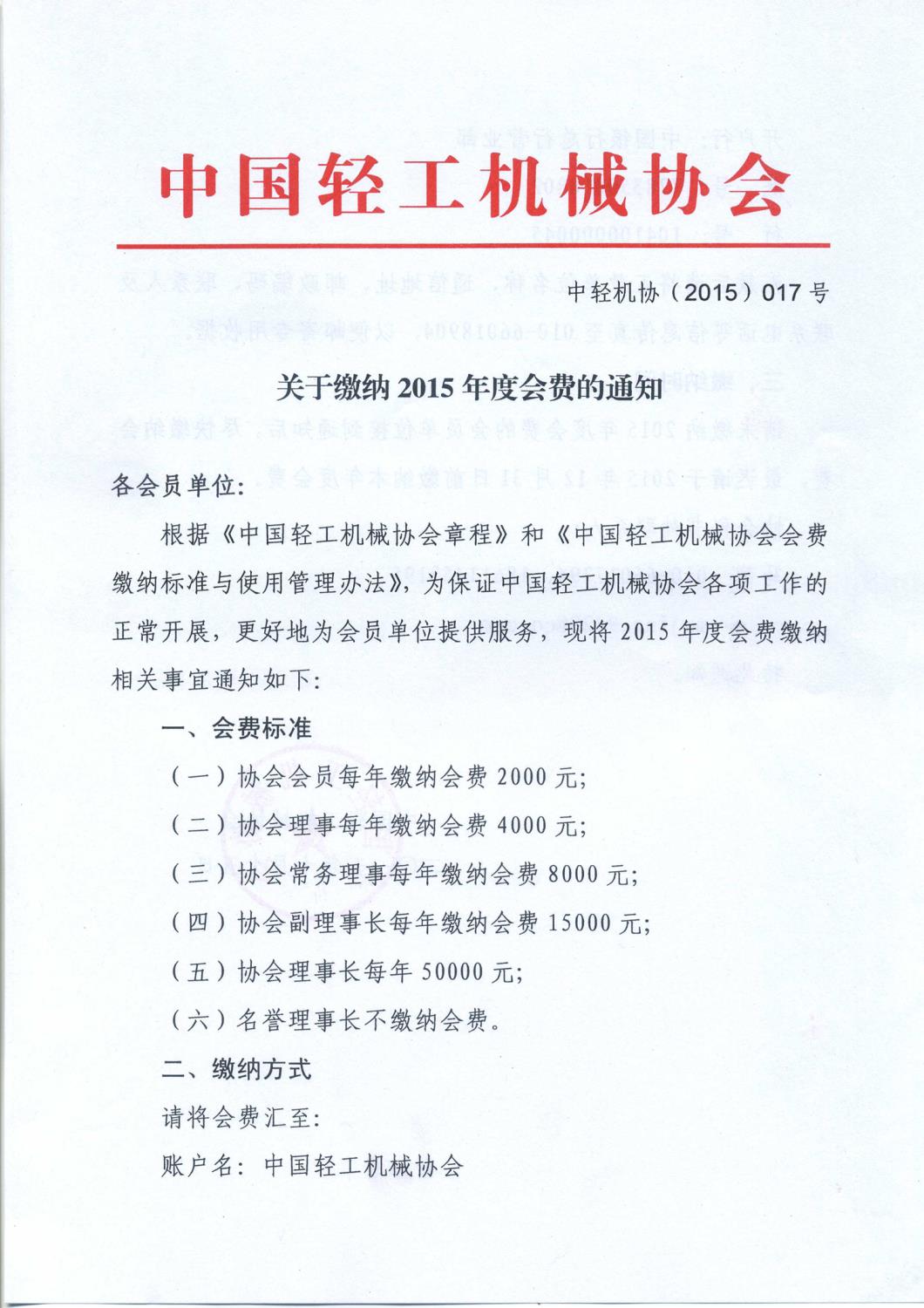 關(guān)于繳納2015年度會費(fèi)的通知