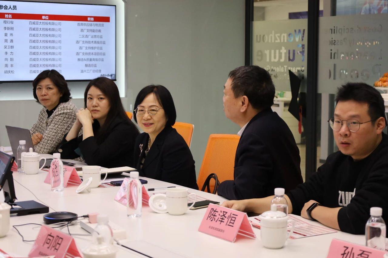 在參觀后的座談會(huì)上,程衍俊總裁和王欣副理事長(zhǎng)分別致詞并介紹了各自的參會(huì)人員。王欣副理事長(zhǎng)對(duì)程總以及百威亞太高層領(lǐng)導(dǎo)們的熱情接待和專(zhuān)門(mén)安排到溫州智能工廠參觀學(xué)習(xí)表示感謝。她表示每次與百威亞太的交流和工廠參觀都會(huì)帶來(lái)不同的感受,百威亞太在數(shù)字化、智能化、碳中和碳排放等方面做出的成績(jī)非常突出。