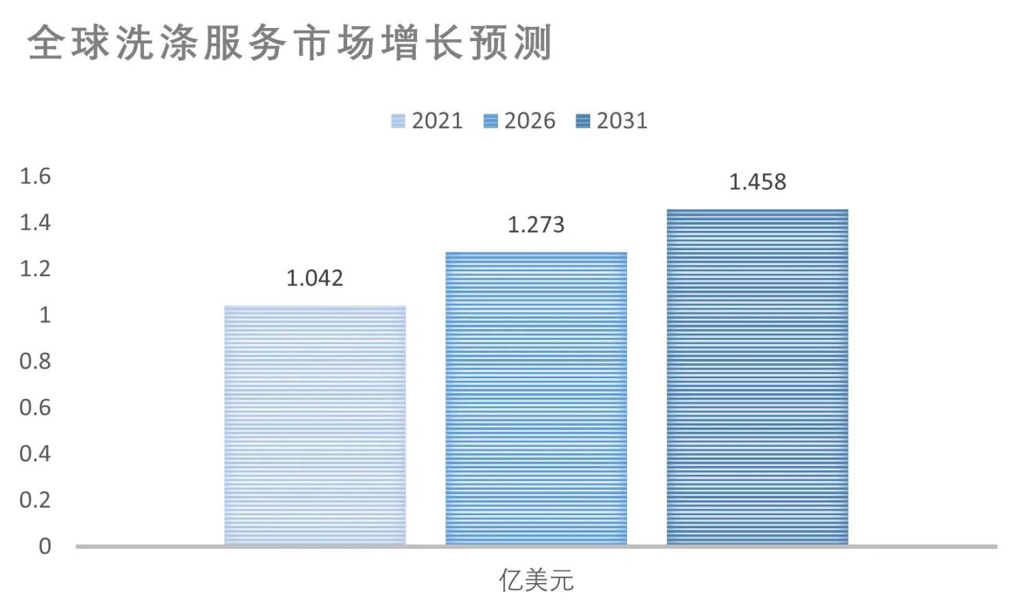 據(jù)Research and Markets的研究,全球洗滌服務市場自2016年以來以2.1%的復合年增長率增長,在2021年達到了近1.042億美元的價值,預計到2026年將以4.1%的增長率增長到1.273億美元。隨后,預計將以2.8%的復合年增長率增長,并在2031年達到1.458億美元。