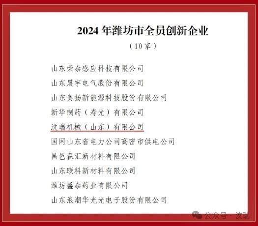 近日,濰坊市總工會(huì)公布了2024年濰坊市全員創(chuàng)新競(jìng)賽名單,汶瑞機(jī)械(山東)有限公司入選濰坊市全員創(chuàng)新企業(yè)。