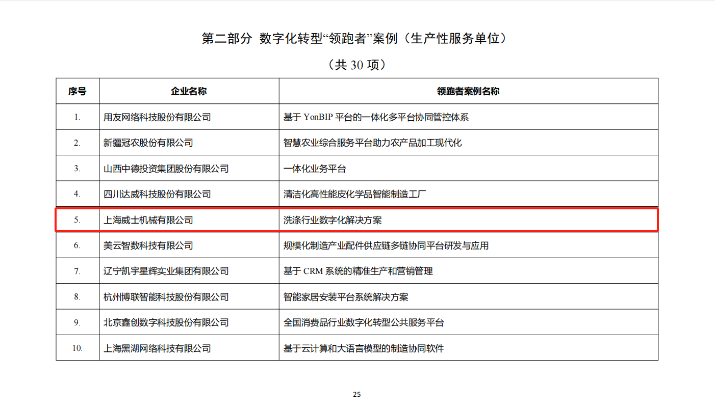 在2024年的中國輕工業(yè)數(shù)字化轉(zhuǎn)型評選中,上海威士機械有限公司憑借其在洗滌行業(yè)數(shù)字化技術(shù)的應(yīng)用和創(chuàng)新,榮獲了這一殊榮。這是對威士機械技術(shù)創(chuàng)新能力的高度認可,也是對其在推動行業(yè)數(shù)字化轉(zhuǎn)型中所做出的卓越貢獻的肯定。
