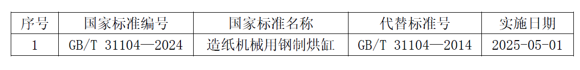 其中,全國輕工機械標(biāo)準(zhǔn)化技術(shù)委員會(SAC/TC101)歸口管理的國家標(biāo)準(zhǔn)《造紙機械用鋼制烘缸》(GB/T 31104—2024)獲批發(fā)布,標(biāo)準(zhǔn)實施日期為2025年5月1日。