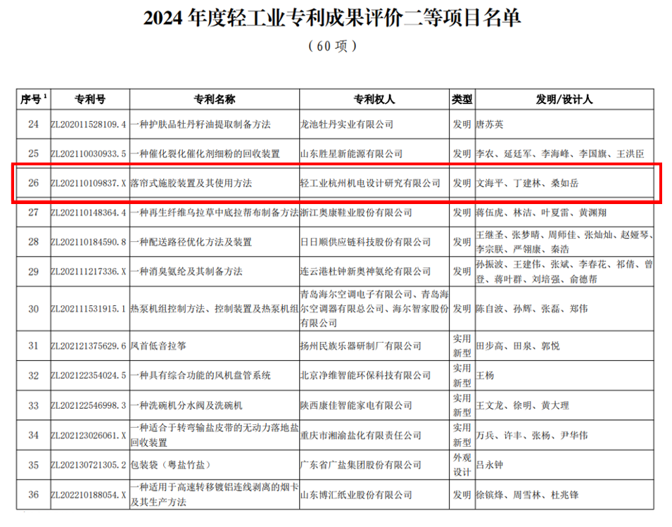 近日,中國(guó)輕工業(yè)企業(yè)管理協(xié)會(huì)公布了2024年度輕工業(yè)專利成果評(píng)價(jià)結(jié)果。經(jīng)專家評(píng)審,杭州機(jī)電院參與評(píng)審的發(fā)明專利“落簾式施膠裝置及其使用方法”榮獲2024年度輕工業(yè)專利成果評(píng)價(jià)二等獎(jiǎng)。