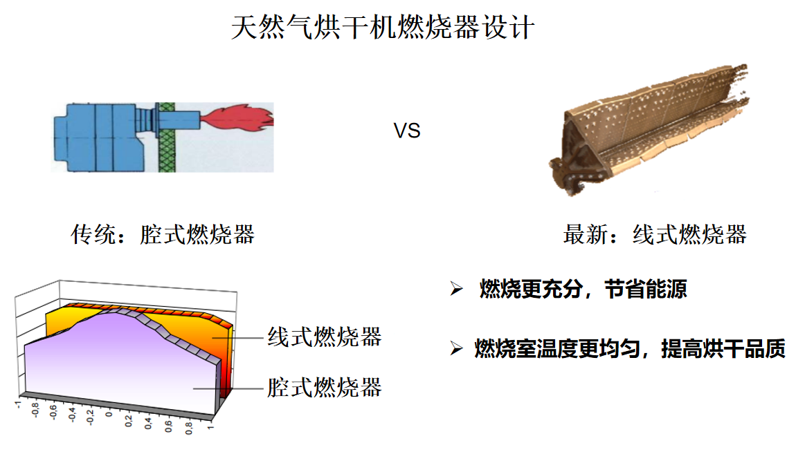 與傳統(tǒng)的腔式燃燒器相比,威士烘干機(jī)采用了最新的線式燃燒器設(shè)計(jì)。這種設(shè)計(jì)使得燃燒更加充分,節(jié)省能源的同時(shí),燃燒室溫度更均勻,從而提高了烘干品質(zhì)。