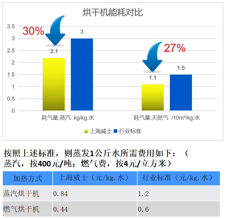 威士的技術(shù)優(yōu)勢(shì)轉(zhuǎn)化為了可觀的經(jīng)濟(jì)效益。通過對(duì)比蒸汽烘干機(jī)和燃?xì)夂娓蓹C(jī)的成本,威士烘干機(jī)顯示出了明顯的成本優(yōu)勢(shì)。
