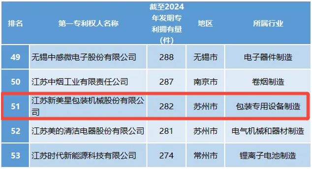 近日,“2024年江蘇制造業(yè)企業(yè)發(fā)明專利百強(qiáng)榜”正式揭曉,新美星憑借卓越的創(chuàng)新實(shí)力與深厚的技術(shù)積累榮耀登榜。值得關(guān)注的是,這已是新美星連續(xù)三年獲此殊榮,并且是包裝專用設(shè)備制造領(lǐng)域唯一上榜企業(yè),彰顯了新美星在行業(yè)內(nèi)的創(chuàng)新引領(lǐng)地位。