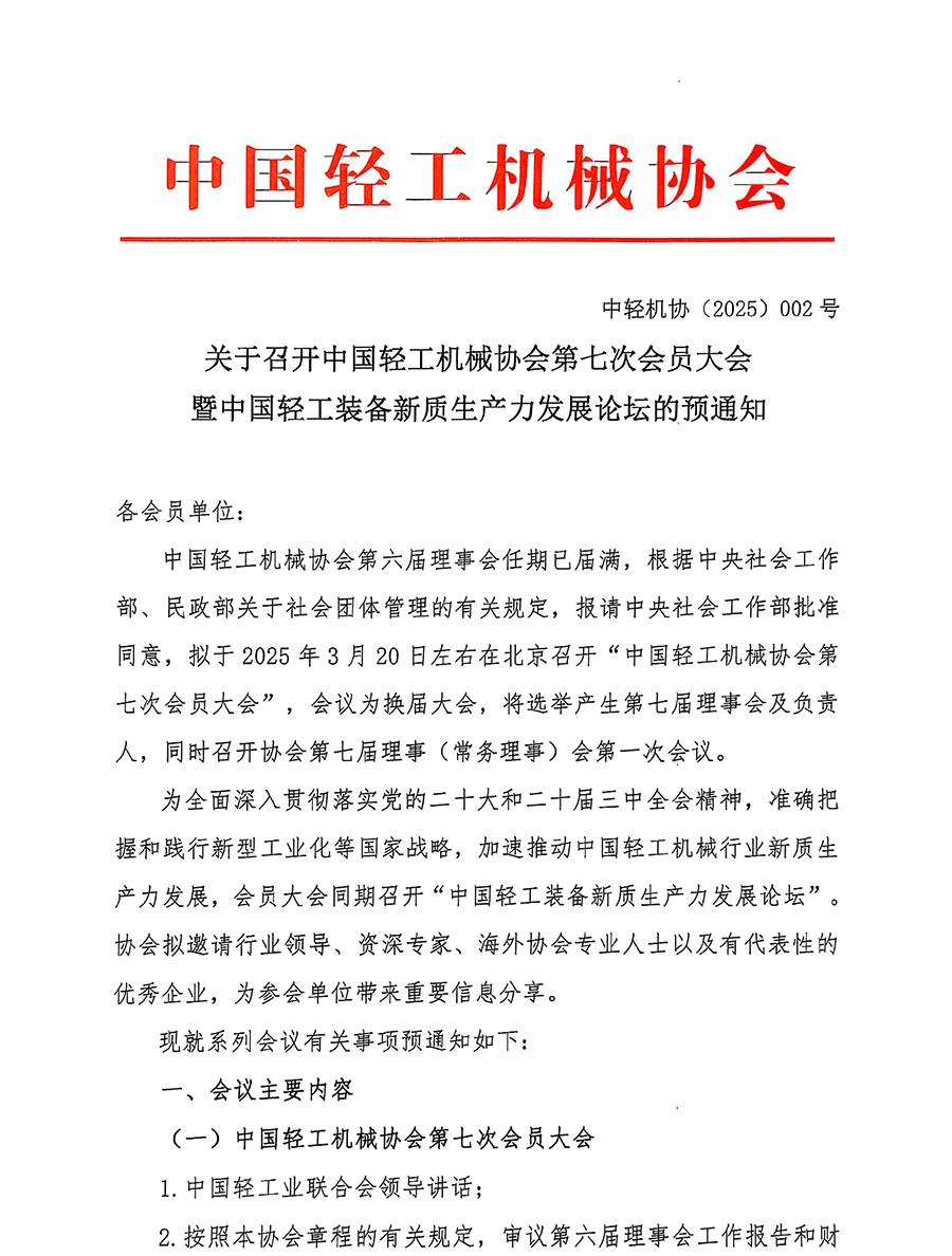 關(guān)于召開中國(guó)輕工機(jī)械協(xié)會(huì)第七次會(huì)員大會(huì)暨中國(guó)輕工裝備新質(zhì)生產(chǎn)力發(fā)展論壇的預(yù)通知
