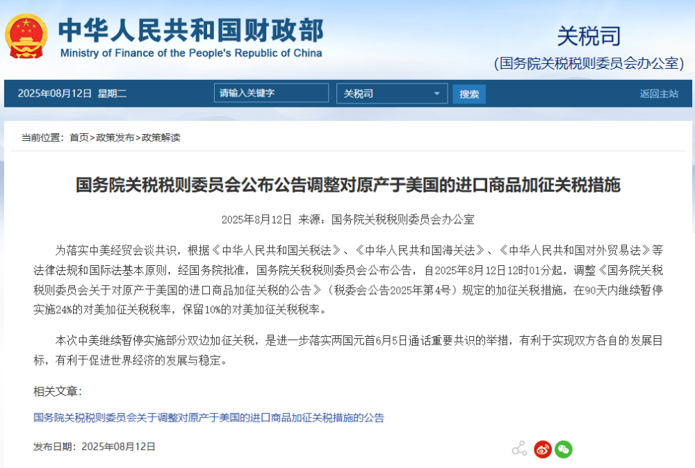為落實中美經(jīng)貿(mào)會談共識,根據(jù)《中華人民共和國關(guān)稅法》、《中華人民共和國海關(guān)法》、《中華人民共和國對外貿(mào)易法》等法律法規(guī)和國際法基本原則,經(jīng)國務(wù)院批準(zhǔn),國務(wù)院關(guān)稅稅則委員會公布公告,自2025年8月12日12時01分起,調(diào)整《國務(wù)院關(guān)稅稅則委員會關(guān)于對原產(chǎn)于美國的進口商品加征關(guān)稅的公告》(稅委會公告2025年第4號)規(guī)定的加征關(guān)稅措施,在90天內(nèi)繼續(xù)暫停實施24%的對美加征關(guān)稅稅率,保留10%的對美加征關(guān)稅稅率。