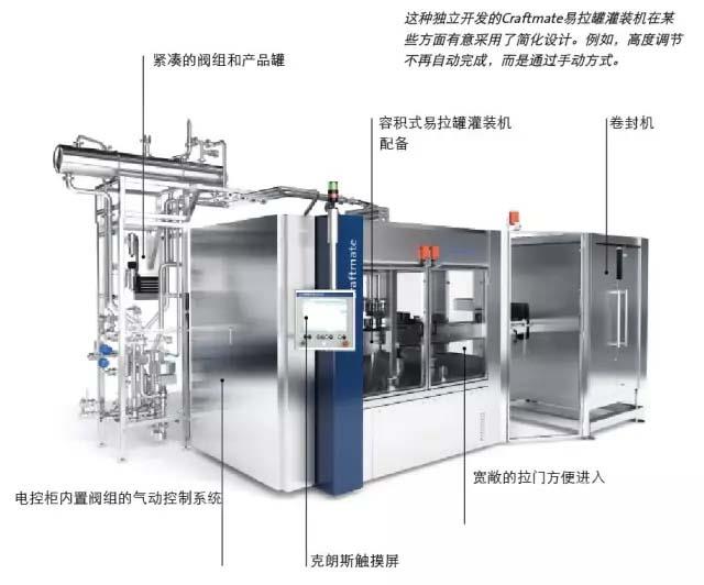 Craftmate易拉罐灌裝機(jī)與閥組以及卷封機(jī)形成非常緊湊的結(jié)構(gòu):電控柜直接相連,節(jié)省占地。閥組的氣動(dòng)控制系統(tǒng)也布置在這里。結(jié)構(gòu)緊湊的閥組與產(chǎn)品罐一起直接安裝在灌裝機(jī)和卷封機(jī)后面,通過(guò)伺服技術(shù)形成電子設(shè)備連接。