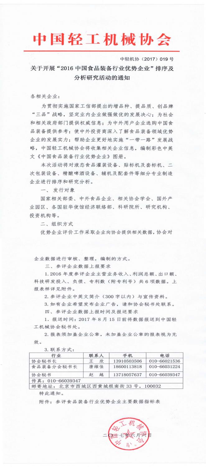 關(guān)于開展“2016中國食品裝備行業(yè)優(yōu)勢企業(yè)”排序機(jī)分析研究活動的通知