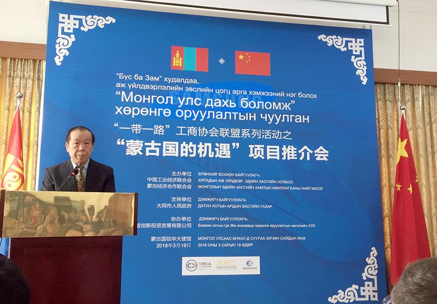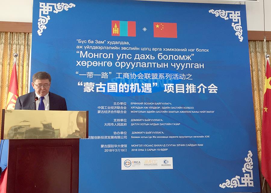 3月19日,中國輕工機械協(xié)會副理事長兼秘書長王欣受中國輕工業(yè)聯(lián)合會國際產(chǎn)能合作企業(yè)聯(lián)盟領(lǐng)導(dǎo)委派參加了在蒙古國駐華大使館舉行的“蒙古國的機遇”項目推介會。這是“一帶一路”工商協(xié)會聯(lián)盟系統(tǒng)活動之一?;顒拥闹鬓k方是中國工業(yè)經(jīng)濟聯(lián)合會和蒙古國金及合作聯(lián)合會,支持單位是蒙古國駐華大使館和大同市人民政府。
