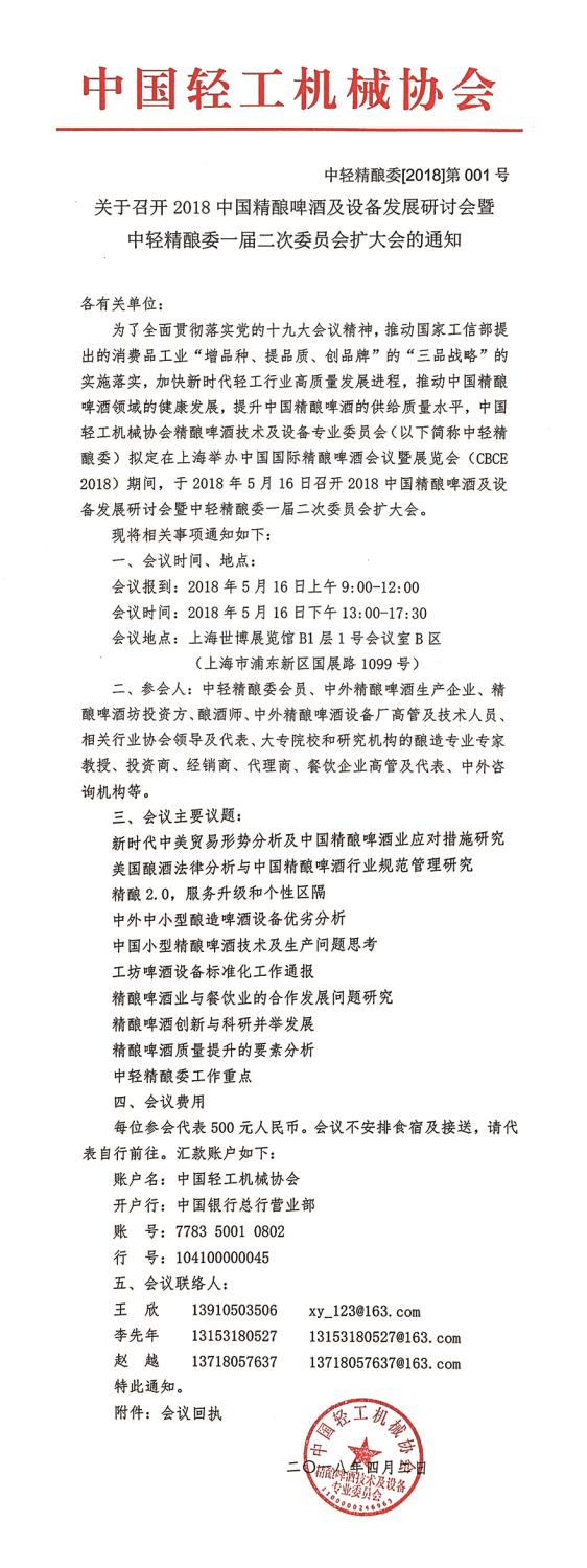 2018中國精釀啤酒及設(shè)備發(fā)展研討會(huì)暨中輕精釀委一屆二次委員會(huì)擴(kuò)大會(huì)