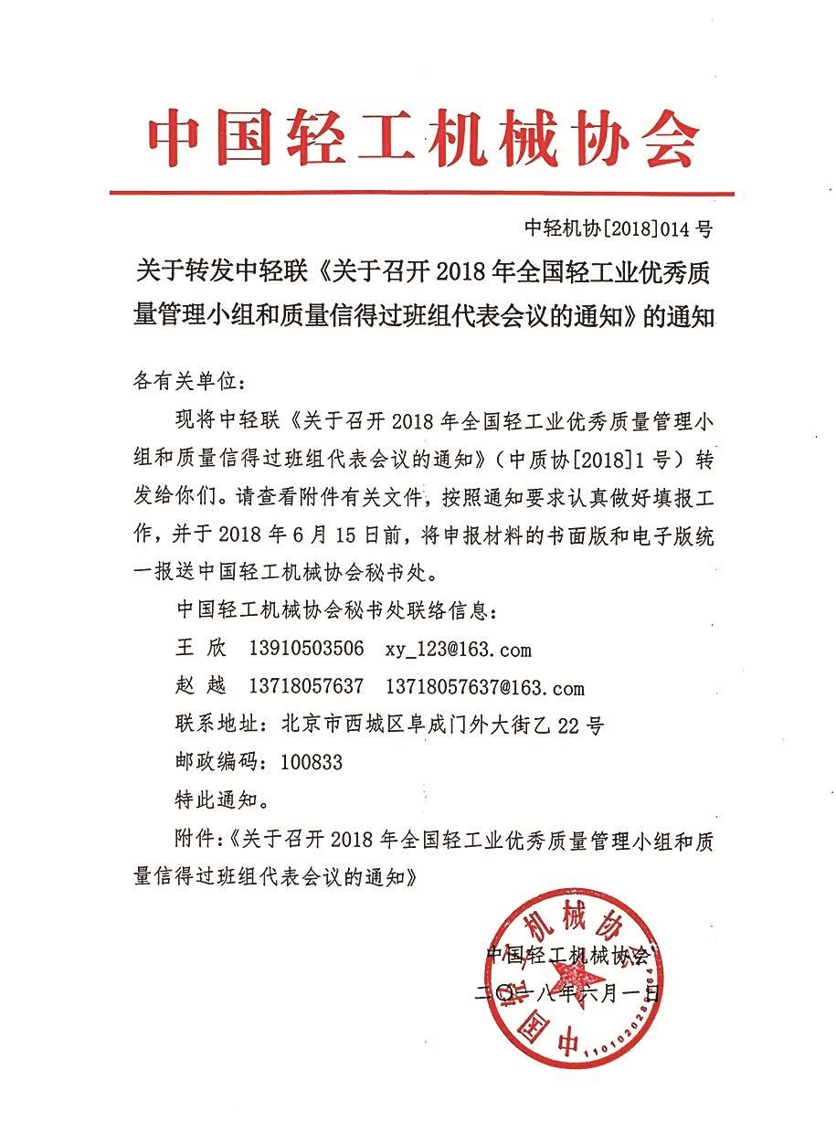 現(xiàn)將中輕聯(lián)《關(guān)于召開2018年全國輕工業(yè)優(yōu)秀質(zhì)量管理小組和質(zhì)量信得過班組代表會(huì)議的通知》(中質(zhì)協(xié)[2018]1號(hào))轉(zhuǎn)發(fā)給你們。請(qǐng)查看下方文件,按照通知要求認(rèn)真做好填報(bào)工作,并于2018年6月15日前,將申報(bào)材料的書面版和電子版統(tǒng)一報(bào)送中國輕工機(jī)械協(xié)會(huì)秘書處。