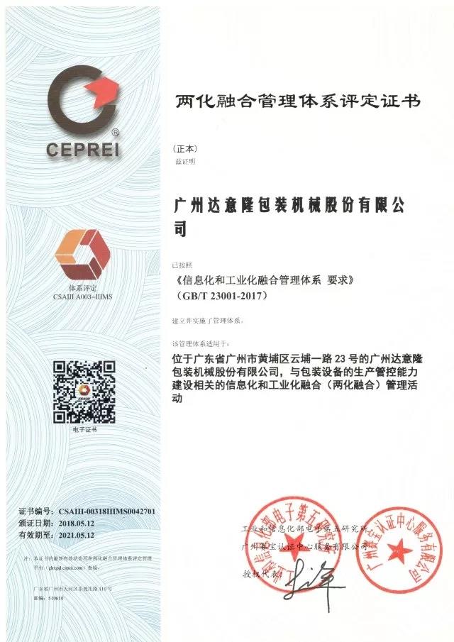 2018年5月12日,達(dá)意隆收到工業(yè)和信息化部電子第五研究所、廣州賽寶認(rèn)證中心服務(wù)有限公司的兩化融合管理系統(tǒng)評(píng)定證書(shū)(證書(shū)編號(hào)CSAIII-00318IIIMS00442701),標(biāo)志著我司按照 《信息化和工業(yè)化融合管理體系要求》(GB/T-23001-2017)建立的兩化融合管理體系取得了階段性成果。