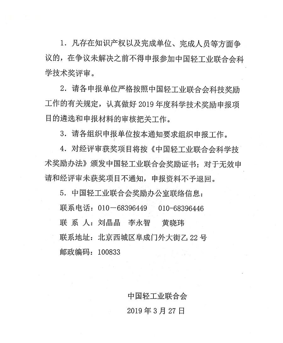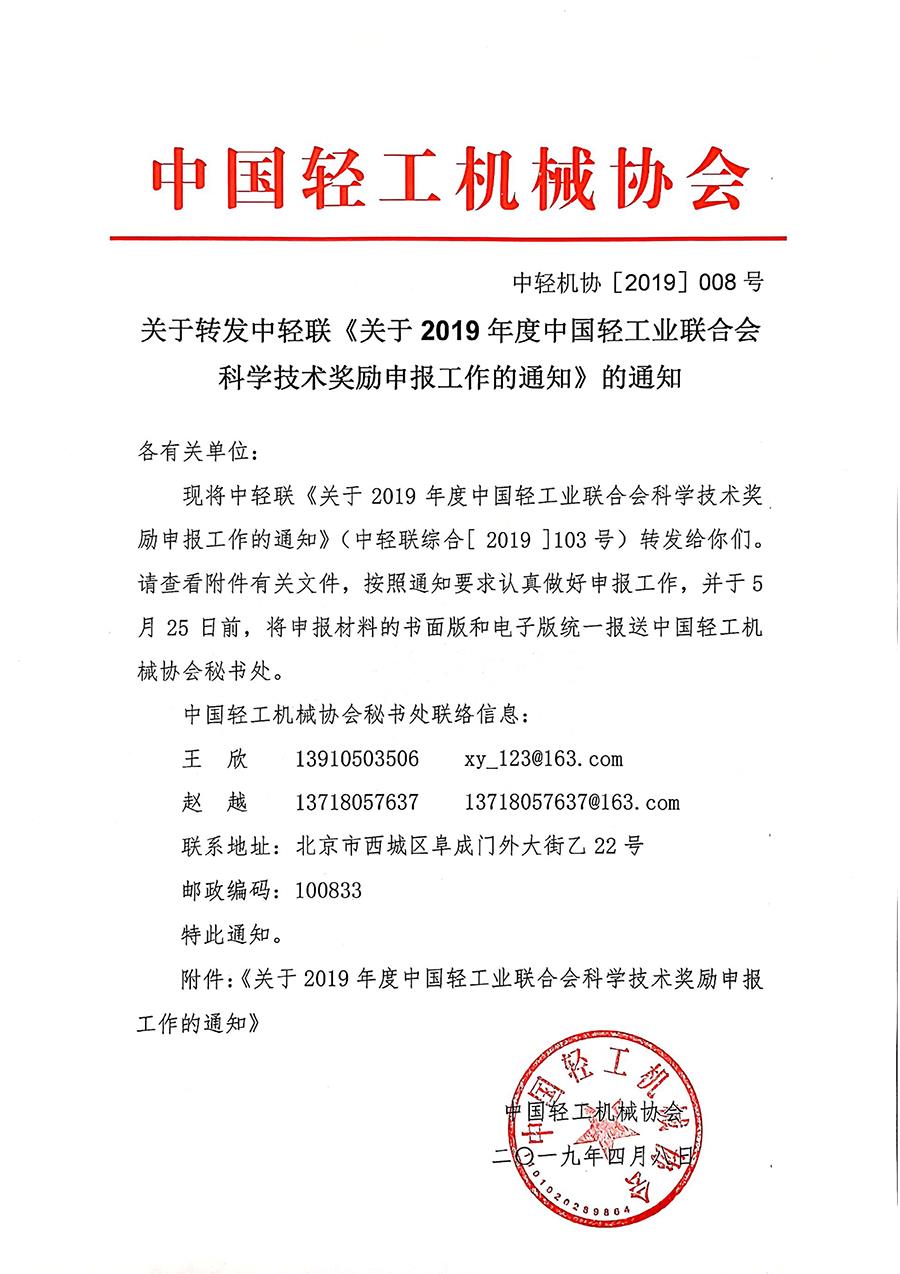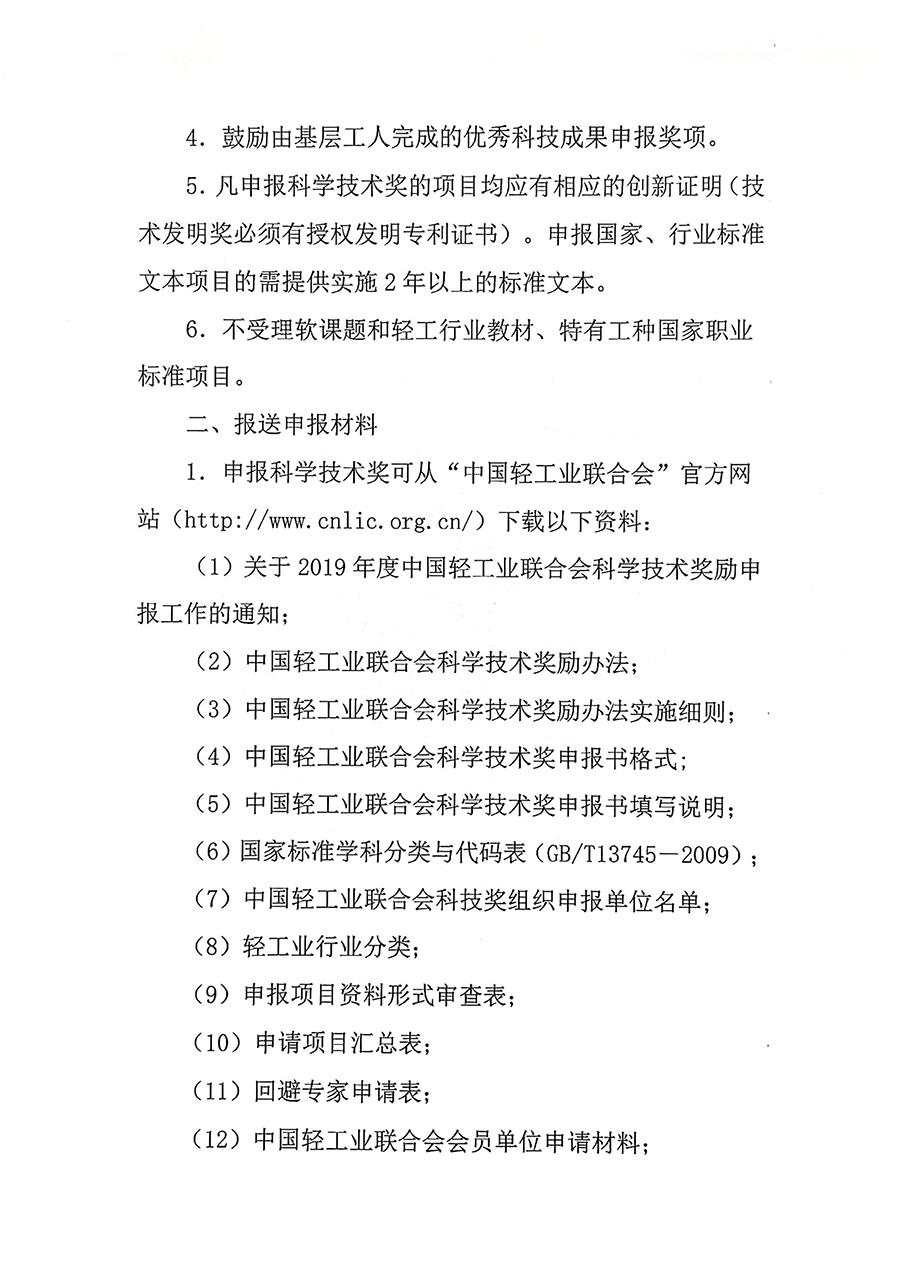 關(guān)于轉(zhuǎn)發(fā)中輕聯(lián)《關(guān)于2019年度中國輕工業(yè)聯(lián)合會科學(xué)技術(shù)獎勵申報工作的通知》的通知