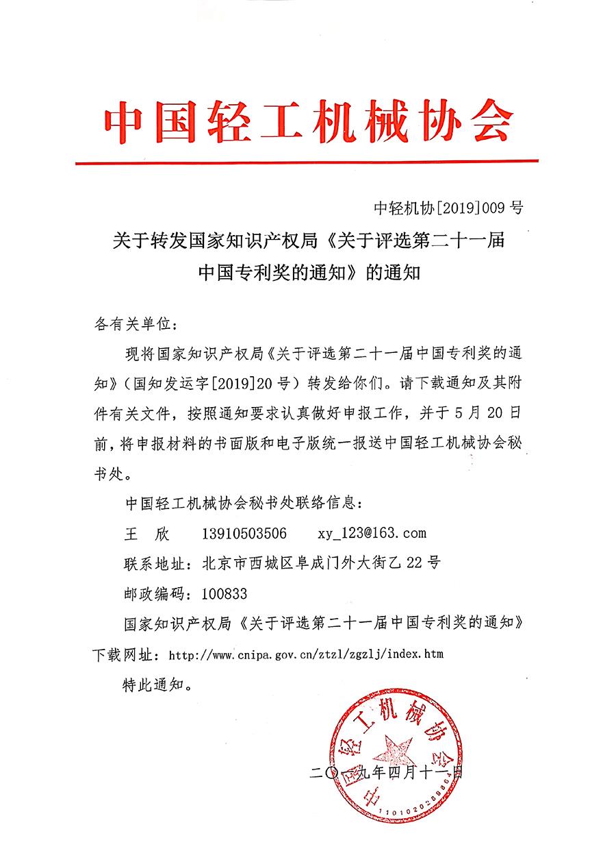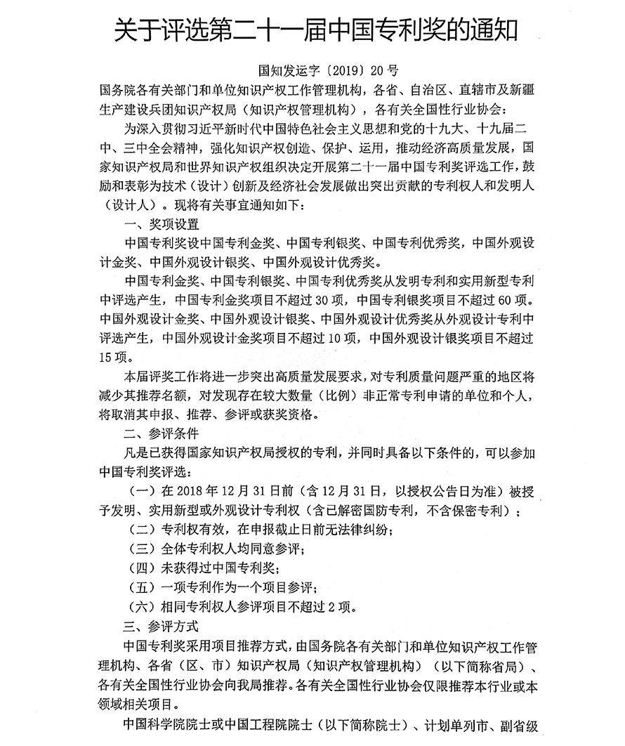 關(guān)于轉(zhuǎn)發(fā)國(guó)家知識(shí)產(chǎn)權(quán)局《關(guān)于評(píng)選第二十屆中國(guó)專利獎(jiǎng)的通知》的通知