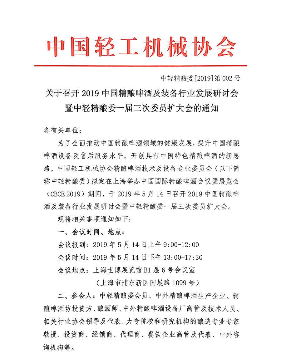 關(guān)于召開2019精釀啤酒及裝備行業(yè)發(fā)展研討會(huì)暨中輕精釀委一屆三次委員擴(kuò)大會(huì)的通知
