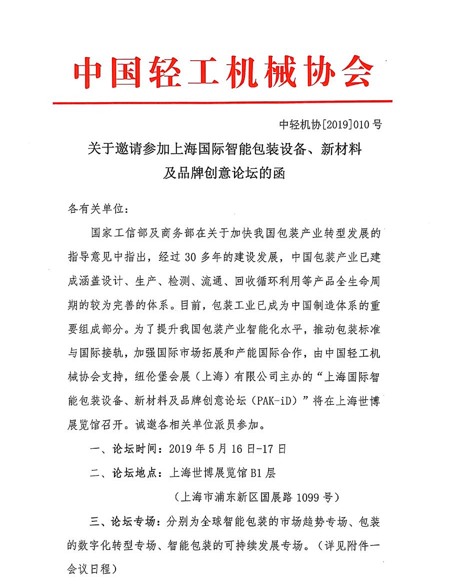 關(guān)于邀請(qǐng)參加上海國際智能包裝設(shè)備、新材料及品牌創(chuàng)意論壇的函