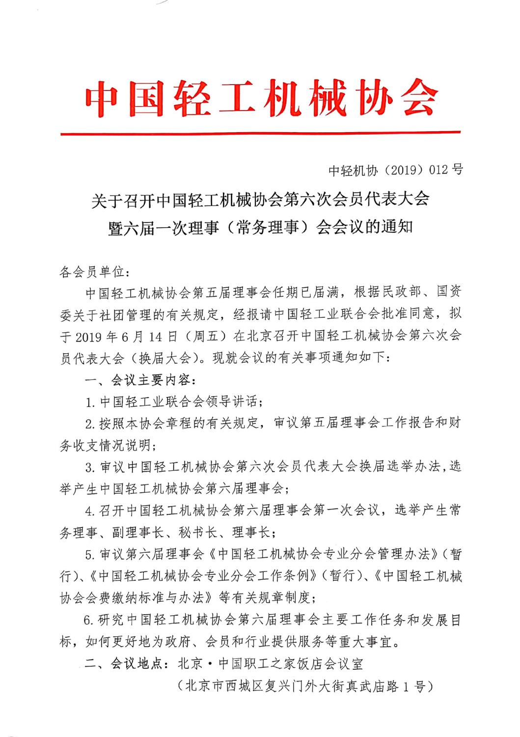 關(guān)于召開中國輕工機械協(xié)會第六次會員代表大會暨六屆一次理事(常務(wù)理事)會會議的通知