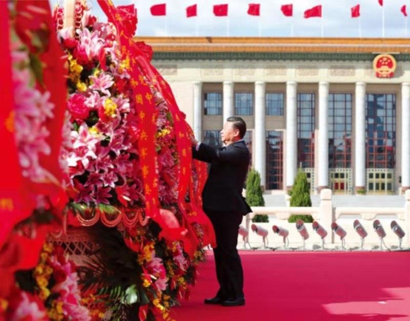 2018年9月30日上午,黨和國家領(lǐng)導(dǎo)人習(xí)近平、李克強(qiáng)、栗戰(zhàn)書、汪洋、王滬寧、趙樂際、韓正、王岐山等來到北京天安門廣場(chǎng),出席烈士紀(jì)念日向人民英雄敬獻(xiàn)花籃儀式。這是習(xí)近平整理花籃上的緞帶。 新華社記者 謝環(huán)馳/攝