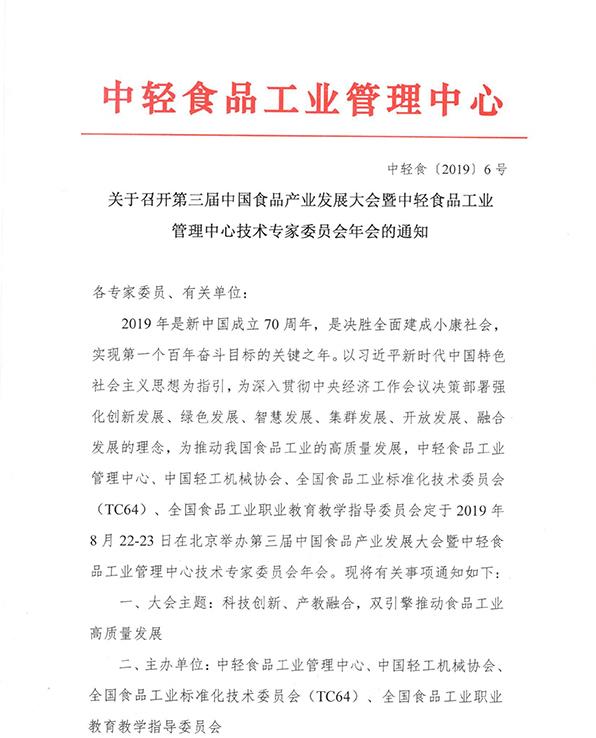 關(guān)于召開第三屆食品產(chǎn)業(yè)發(fā)展大會(huì)暨中輕食品工業(yè)管理中心技術(shù)專家委員會(huì)年會(huì)的通知
