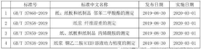 2019年8月30日,國(guó)家市場(chǎng)監(jiān)督管理總局(國(guó)家標(biāo)準(zhǔn)化管理委員會(huì))批準(zhǔn)公布了501項(xiàng)國(guó)家標(biāo)準(zhǔn)和6項(xiàng)國(guó)家標(biāo)準(zhǔn)修改單(2019年第10號(hào)),其中涉及造紙國(guó)家標(biāo)準(zhǔn)4項(xiàng),具體見下表,請(qǐng)各相關(guān)單位積極實(shí)施新標(biāo)準(zhǔn)。