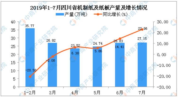 據(jù)中商產(chǎn)業(yè)研究院數(shù)據(jù)庫顯示,2019年1-2季度四川省機(jī)制紙及紙板產(chǎn)量有所增長,增長19.97%。2019年7月四川省機(jī)制紙及紙板產(chǎn)量為27.15萬噸,同比增長22.96%。2019年1-7月四川省機(jī)制紙及紙板產(chǎn)量為188.15萬噸,同比增長15.12%。