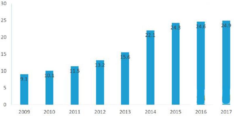 2009-2017年美國(guó)精釀啤酒產(chǎn)量(百萬(wàn)桶)