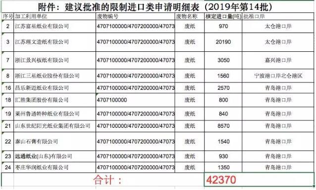 2019年11月5日,固廢中心公布的2019年第14批限制進(jìn)口類申請明細(xì)表顯示,共計廢紙核定進(jìn)口總量為4.237萬噸。