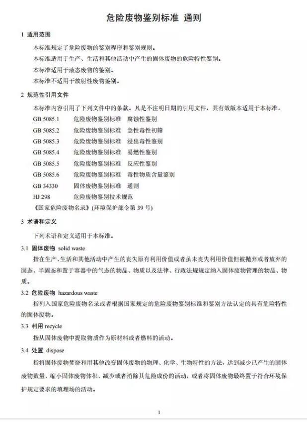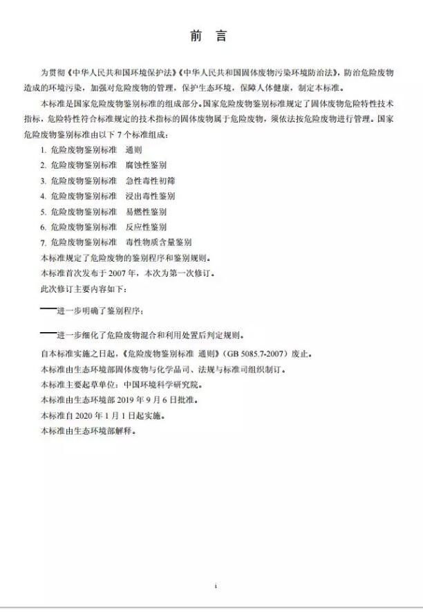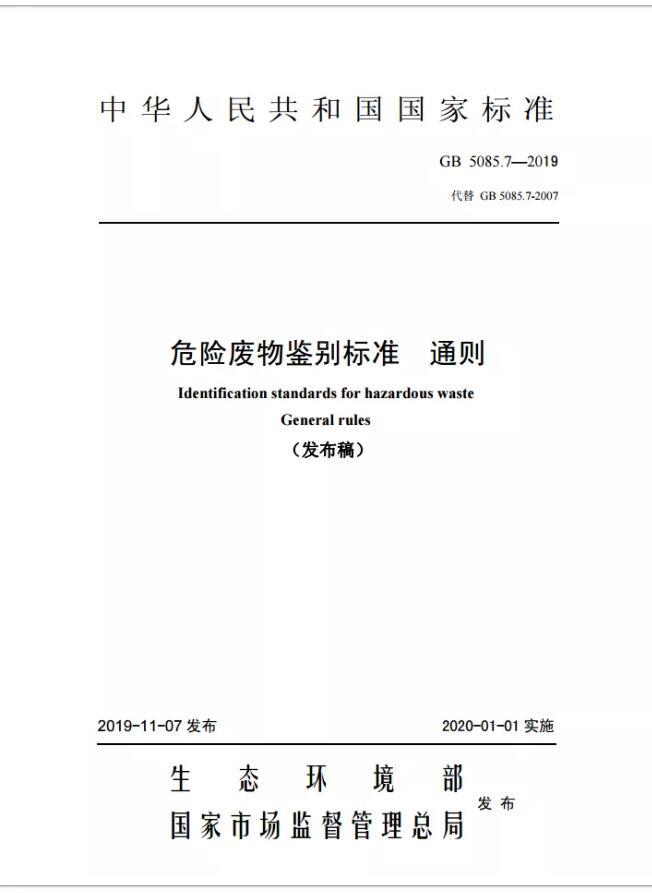 為貫徹防治污染,保護和改善生態(tài)環(huán)境,2019年11月7日,生態(tài)環(huán)境部與國家市場監(jiān)督管理總局聯(lián)合發(fā)布了《危險廢物鑒別標(biāo)準(zhǔn) 通則》(GB 5085.7-2019)。