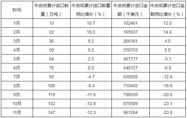 根據(jù)中國海關(guān)數(shù)據(jù)顯示:2019年1-11月中國牛皮紙進(jìn)口數(shù)量為147萬噸,同比下降12.3%;2019年1-11月中國牛皮紙進(jìn)口金額為961264千美元,同比下降23.8%。