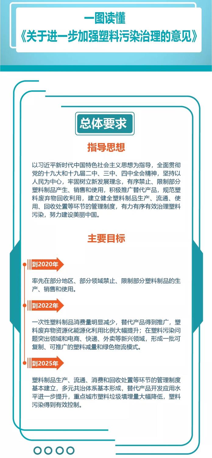 國家發(fā)展改革委、生態(tài)環(huán)境部19日公布《關于進一步加強塑料污染治理的意見》,到2020年底,我國將率先在部分地區(qū)、部分領域禁止、限制部分塑料制品的生產、銷售和使用,到2022年底,一次性塑料制品的消費量明顯減少,替代產品得到推廣。