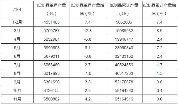 2019年1-11月中國紙制品產(chǎn)量及增速統(tǒng)計(jì)表