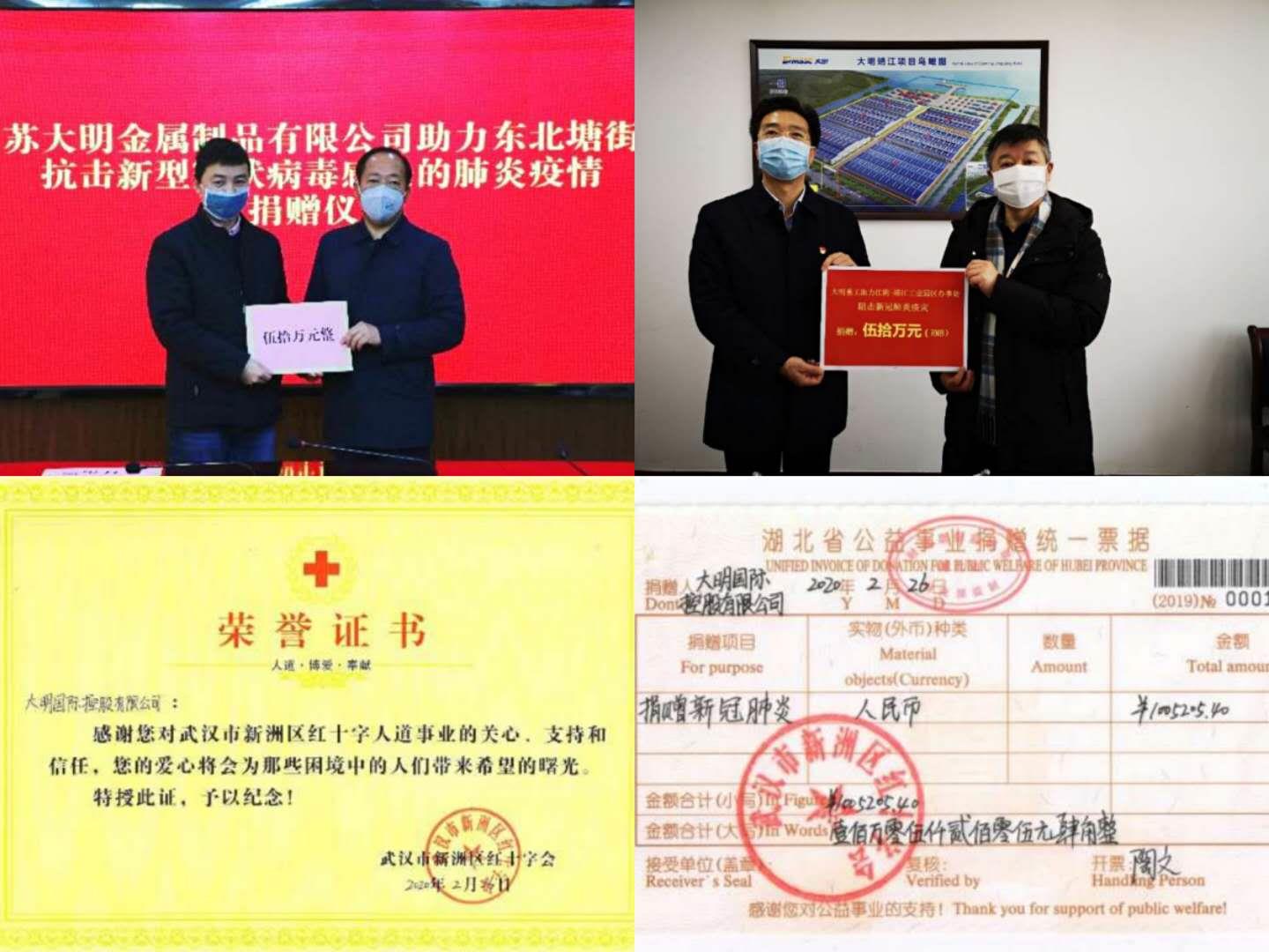 以實際行動抗擊疫情,用拳拳愛心回報社會。大明集團旗下江蘇大明、湖北加工中心、太原加工中心、大明重工和全體干部員工捐款共計240萬多元,直接助力到抗擊疫情的第一線。