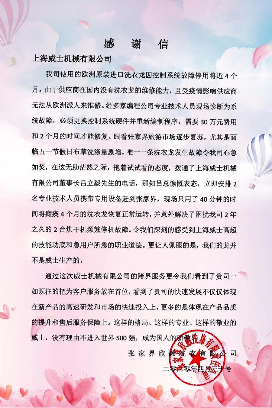 接到請(qǐng)求信息后,威士機(jī)械董事長(zhǎng)呂立毅急用戶所急,立即安排2名專業(yè)技術(shù)人員攜帶專用工具趕到張家界,只用了2天時(shí)間就讓洗衣龍正常運(yùn)轉(zhuǎn),一并解決了困擾洗衣廠1年多的2臺(tái)烘干機(jī)頻繁停機(jī),只能靠人工強(qiáng)制操作的故障。威士機(jī)械快速馳援服務(wù)理念,大愛(ài)無(wú)疆的奉獻(xiàn)精神讓洗衣廠倍感溫暖。