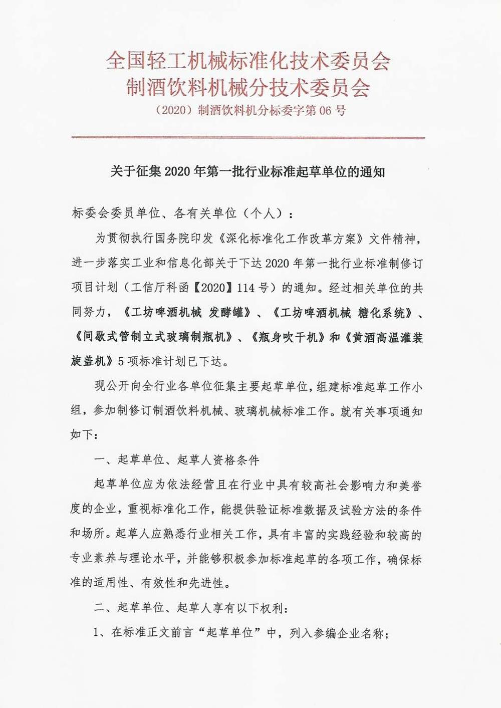 為貫徹執(zhí)行國務院印發(fā)《深化標準化工作改革方案》文件精神,進一步落實工業(yè)和信息化部關于下達2020年第一批行業(yè)標準制修訂項目計劃(工信廳科函【2020】114號)的通知。經(jīng)過相關單位的共同努力,《工坊啤酒機械 發(fā)酵罐》、《工坊啤酒機械 糖化系統(tǒng)》、《間歇式管制立式玻璃制瓶機》、《瓶身吹干機》和《黃酒高溫灌裝旋蓋機》5項標準計劃已下達。現(xiàn)公開向全行業(yè)各單位征集主要起草單位啦!