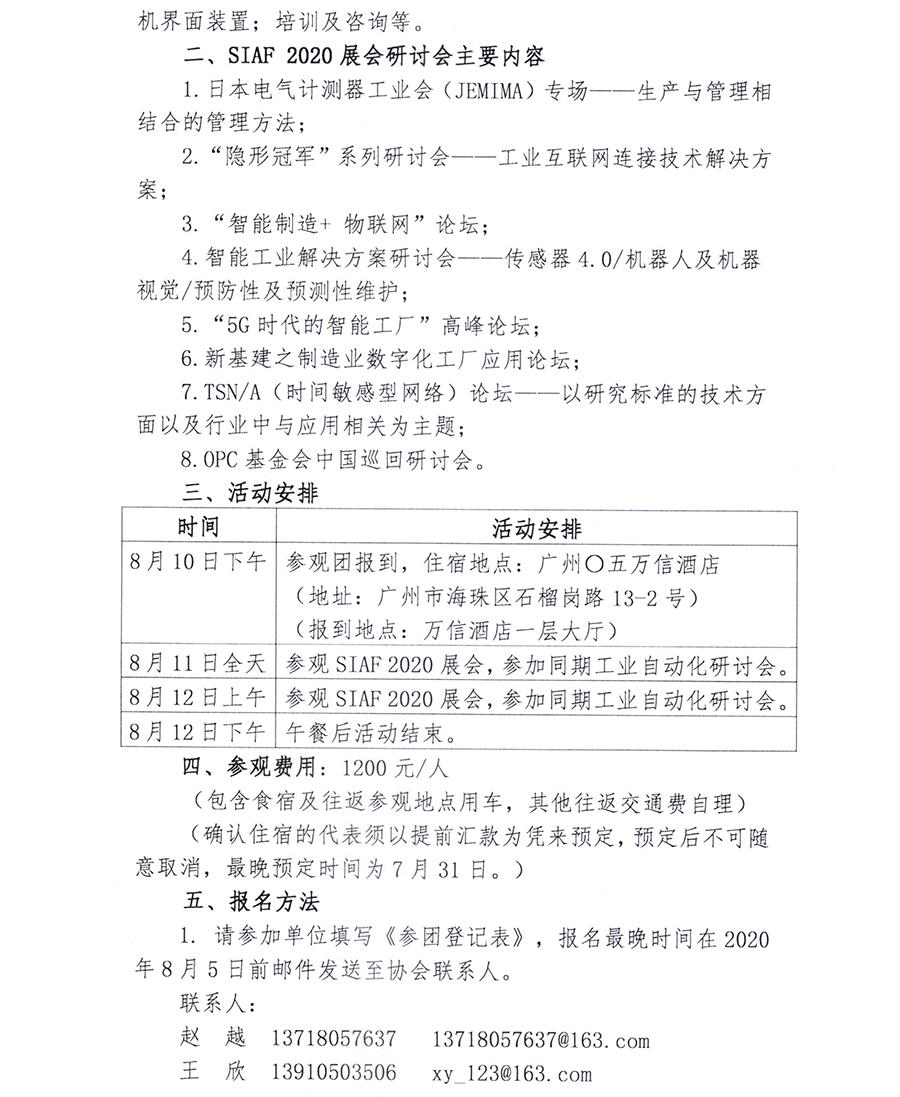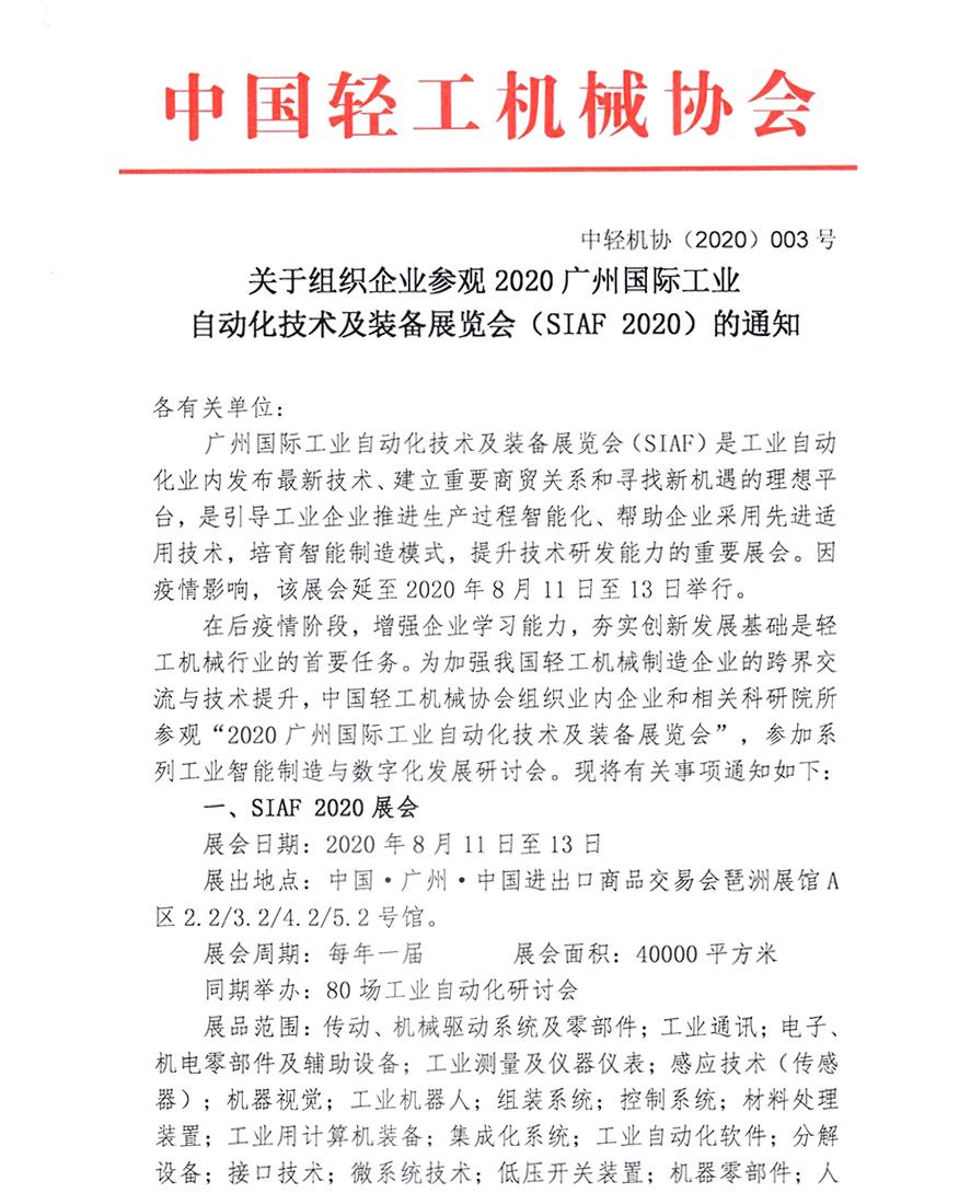 關(guān)于組織企業(yè)參觀2020廣州國際工業(yè)自動化技術(shù)及裝備展覽會(SIAF 2020)的通知