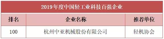 由中國輕工機械協會推薦的杭州中亞機械股份有限公司榮登2019年度中國輕工業(yè)科技百強榜單: