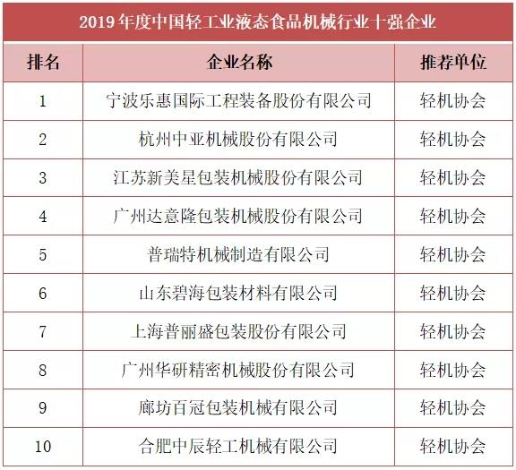 由中國輕工機械協會推薦,與中國輕工業(yè)聯合會共同評選出2019年度中國輕工業(yè)液態(tài)食品機械行業(yè)十強企業(yè),榜單如下: